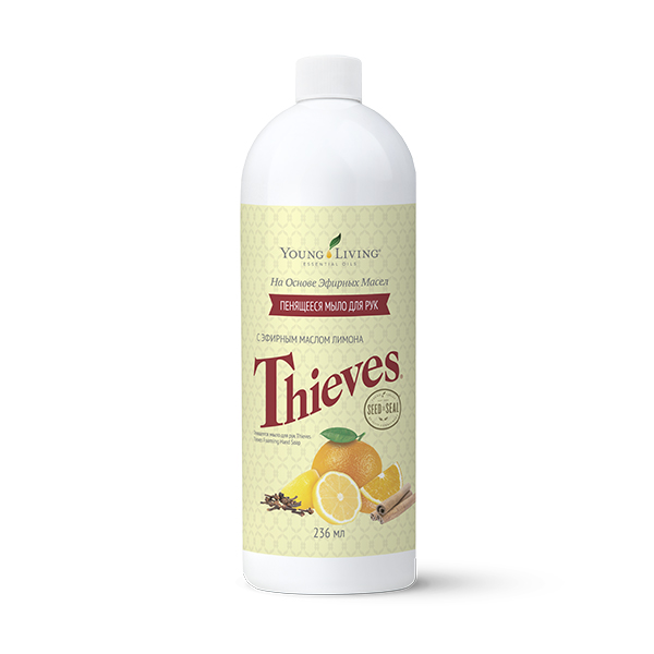 Пенистое мыло для рук Thieves очищает, защищает и ухаживает за кожей благодаря содержанию смеси эфирных масел Thieves, чистых эфирных масел лимона и апельсина, сока алоэ, гинкго и витамина E. При дозировании образует густую пену. Пенистое мыло для рук Thieves содержит мягкие компоненты, которые не сушат кожу и не повреждают ее естественный защитный слой даже при частом применении